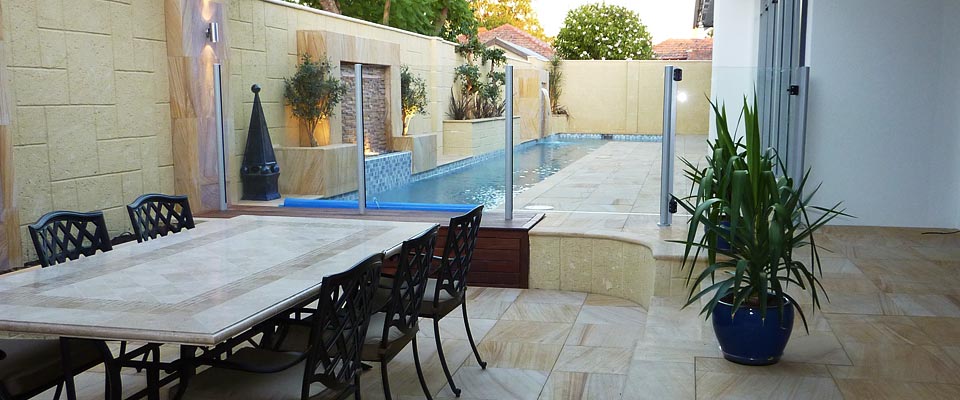This project, completed in 2012 used a combination of teakwood natural stone pavers and bullnosing with decorative wall cladding. The poolscape was further enhanced with a stack stone water feature.